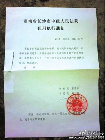 大西北网7月15日讯 据京华时报报道:7月12日,因父亲曾成杰在被执行死刑之前家属未得到通知,其女曾珊在微博质疑长沙中级人民法院。长沙中院表示曾成杰未曾要求见亲属。14日,曾珊称收到了长沙中级人民法院13日寄出的死刑执行通知,并在其微博上予以展示。当晚,曾珊在天涯网就此事与网友访谈。