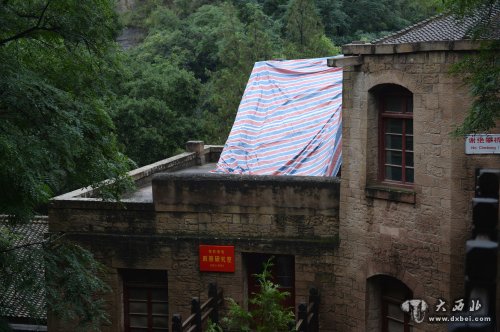 杨家岭革命旧址中共中央办公厅的房顶铺上了彩条布防止雨水渗漏(新华社记者7月15日摄)。