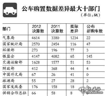 此外,中国气象局2011年的决算报告显示其有公车3380辆,到了2012年就成了4614辆,多出来1200多辆。而其报告称,2012年公务用车购置费286.07万元,只更新了22辆。