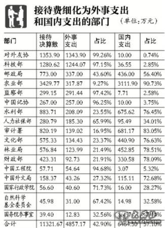 记者统计发现,在部分已分类公布了外事和国内支出数额的单位中,接待费用约四成用于涉外接待,近六成“花”在国内。