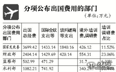 今年,针对“三公”经费中的出国经费决算,国家发改委、财政部、监察部、商务部、水利部等首次分类公布详细数额。出国经费从名目上主要分为国际会议、磋商谈判、境外培训、调研费几大类。其中,出国经费公布程度较高的几个部门,首次单列出了这几个名目的花费。