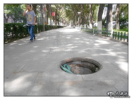 大西北网7月22日讯 “人行道上丢了井盖,迟迟没有修复,太危险了。”昨日,市民高先生反映,位于近水广场人行道上的井盖丢失,这里人来人往,不少市民经过这里时小心翼翼。不少市民表示,特别是晚上光线昏暗的时候,一不小心就会踩下去,希望相关部门尽快修复。