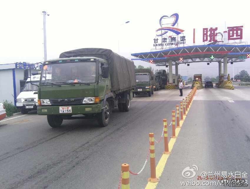大西北网7月23日讯 据兰州易水白金微博发帖,陕西武警救援部队携带重型工程机械和救援装备,通过陇西收费站驰往岷县灾区。感谢你们,一路平安!