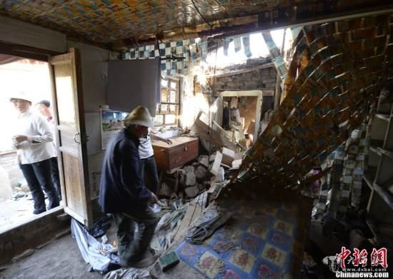 图为甘肃省定西市岷县蒲麻镇吊沟村民正在房屋废墟中搜寻抢救能使用的物资。中新社发 侯宇 摄