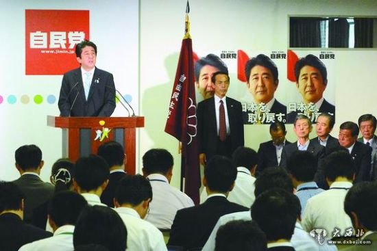 日本首相安倍晋三22日在东京自民党总部会见记者,阐述自民党胜选后的相关政策。