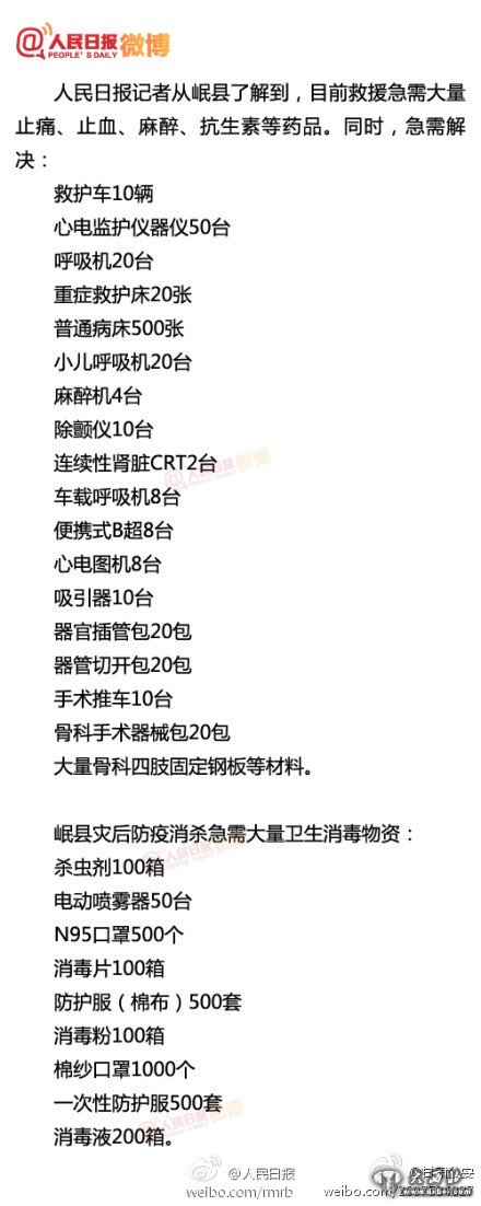 大西北网7月23日讯 人民日报记者银燕消息,目前救援急需:救护车10辆、心电监护仪器仪50台、呼吸机20台、杀虫剂100箱、电动喷雾器50台、N95口罩500个、消毒片100箱、防护服(棉布)500套、消毒粉100箱、一次性防护服500套、消毒液200箱,止痛、止血、麻醉、抗生素等药品。