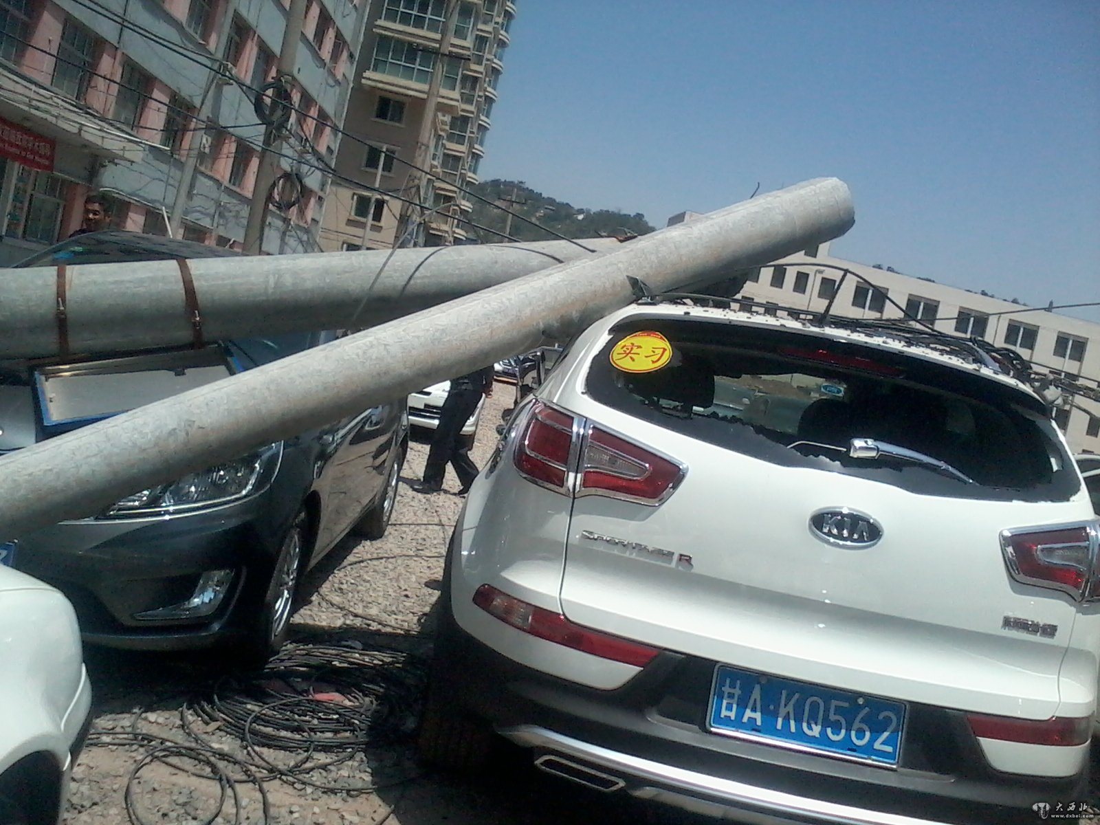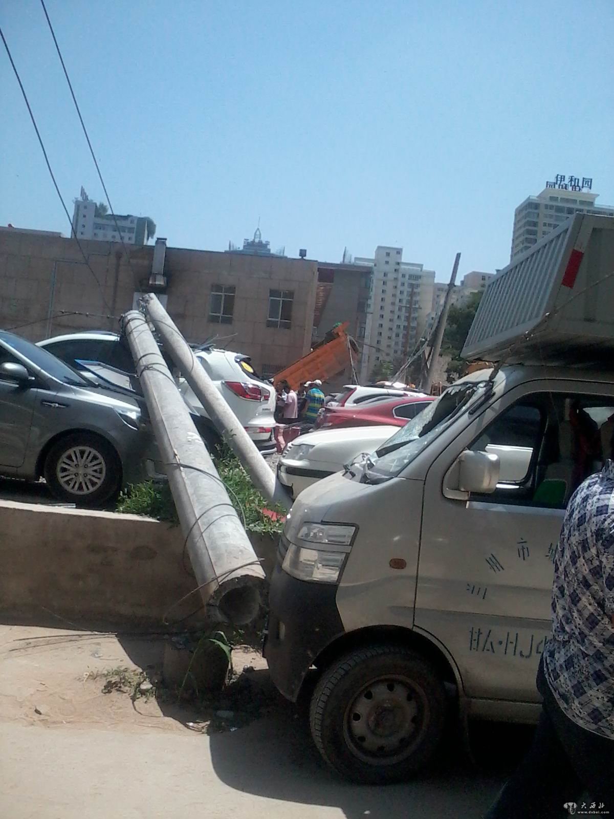 大西北网7月23日讯 7月23日上午11时30分左右,在西关十字兰大二院后面的施工地点,一辆工程自卸车因其后卸货厢没有升降到位,在行驶的过程中拉扯到电线,导致电线杆倒塌,损坏了停车场停放的8辆车。