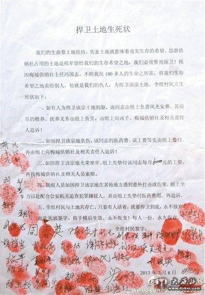 在这封“捍卫土地生死状”上,湖南安化县乐安镇蚩尤村夏家组近百名村民在生死状中按下手印宣誓:为捍卫土地,全组村民立生死状如下:一,如有人为捍卫该土地捐躯,该同志由组上风光安葬,其应尽的赡养、抚养义务由组上负责;二,如因捍卫该土地负伤,该同志的医药费、误工费等先由组上垫付;三,如因捍卫该宗土地光荣坐牢,组上先垫付该同志每月6000元工资……五,此生死状签字、按手模后生效,永不叛变。