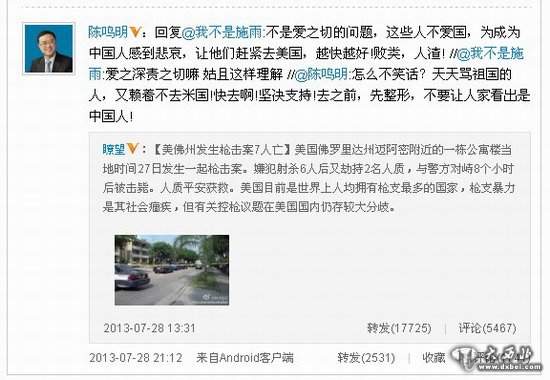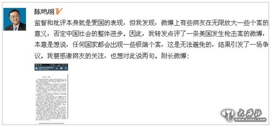 陈鸣明在长文回应中首先表明了事情的原委。他说,监督和批评本身就是爱国的表现,但我发现,微博上有些网友在无限放大一些个案的意义,否定中国社会的整体进步。因此我转发点评了一条美国发生枪击案的微博,本意是想说,任何国家都会出现一些极端个案,这是无法避免的,结果引发了一场“口水”。