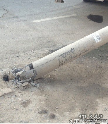 大西北网7月30日讯 据@东岗交警五中队微博发帖,30日早晨7时许,一辆重型货车嘉峪关南路掉头时,撞毁了一根水泥电线杆。事故发生后,我中队启动应急预案,在事故现场拉上了警戒线和护网,加派执勤岗位确保此路段疏导交通,并联系相关部门进行抢修。