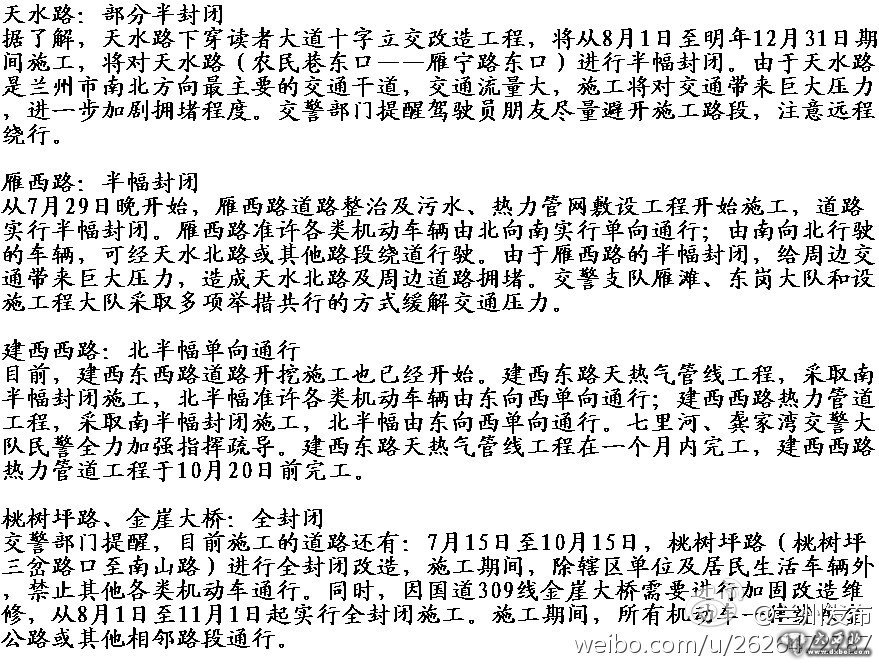 大西北网8月1日讯 据@兰州发布微博消息:天水路、雁西路、建西东西路等道路半幅施工,对周边道路交通影响较大。交警部门在全力疏导的同时,提醒驾驶员朋友提前绕行。