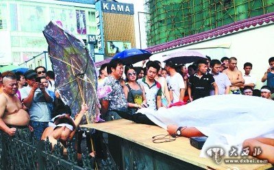 昨天下午4点左右,闹剧策划者推着躺有“尸体”的车子在闹市走动,不少市民围观。