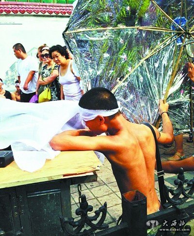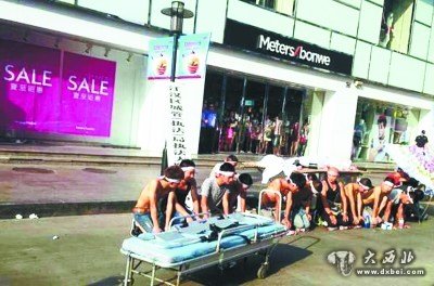 大西北网8月4日讯 据武汉晚报报道:昨天下午3点多,中山大道佳丽广场后面出现了戏剧性一幕:十多名赤膊男子披麻戴孝,用门板抬着一具“尸体”在此示威,宣称城管打死人了,还将江汉城管某执法队门牌给取了下来。记者了解后得知,这其实是因为小贩不满城管执法,策划的一出闹剧。