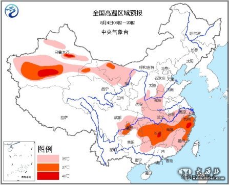中央气象台8月4日06时继续发布高温橙色预警:预计今天白天,江南、江汉大部、四川盆地大部、重庆大部、贵州东部、华南北部、江淮南部、黄淮西部、陕西东南部、华北西南部、内蒙古西部、甘肃西部以及新疆南疆盆地大部和吐鲁番盆地等地有35℃以上的高温天气;其中,湖南大部、江西中北部、浙江大部、四川盆地东南部、南疆盆地中南部、吐鲁番盆地、内蒙古西北部等地的部分地区最高气温有37~39℃,湖南东部、浙江东部、南疆盆地南部和吐鲁番盆地等地的局部地区最高气温可达40~41℃。