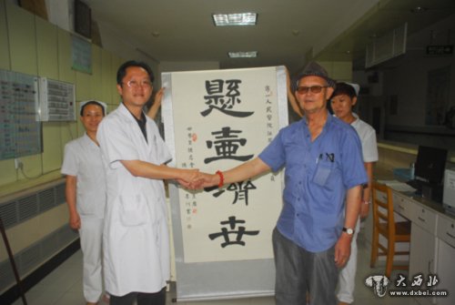 大西北网讯 “你最近身体还好吧?”,“在恢复过程中,有什么需要帮助的,尽管给我们打电话……;“我很好,真的恢复得很好。谢谢你们……”昨日,兰州市第一人民医院泌尿科的医护人员拨通王老先生的电话,逐个和王老先生通话。前天,他们刚刚收到了王老先生亲自送来的一副饱蘸深情的字画,上面写着“悬壶济世”四个大字。