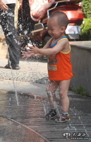 8月13日,一小孩儿在喷泉旁玩耍