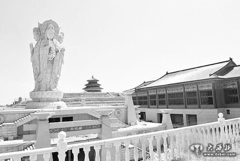 登上数十级台阶,来到酷似天坛的建筑边,只见几百米外的几十米高的建筑上又有一个“天坛”,陵园东北角是一座巨大的观音像。再往东边的一片湖,是兑公咀湖。