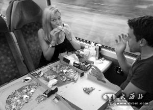 梅塞森跟朋友在火车上享用比萨