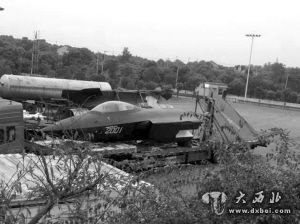 照理说,这种型号的战斗机应该是严密保管的,怎么就这样贸贸然,且由两辆民用货车毫无遮挡地拉了出来?