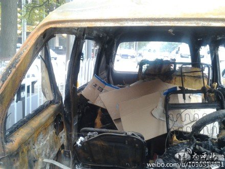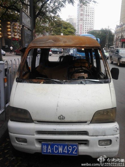 在五泉山车站前临近旧大路口,一辆已经烧的面目全非的面包车停靠在马路边,不知是何因?