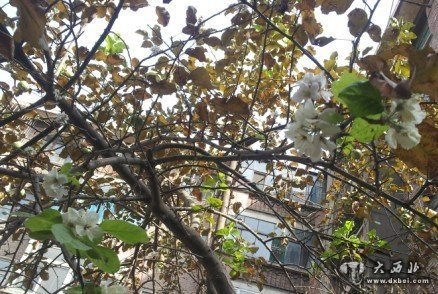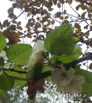 大西北网8月29日 接近中秋了,按理说应该到了收获的季节,然而,在桥梁处家属院的一角,一棵挂满青青果实的苹果树上离奇的又开出了许多淡粉色的果花,淡淡的花香不仅引来了蜜蜂的光临,还惹的院子里的居民们驻足欣赏。据居民们讲,这棵树每年秋季都会出现开花的情况。