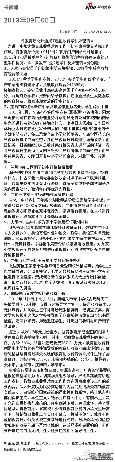 大西北网9月5日讯 为进一步加大教育乱收费治理工作,切实改进教育系统工作作风,省教育厅9月5日在厅门户网站公开通报了2013年1-8月份受理的7起教育乱收费信访举报办理及查处典型案件情况。 (责任编辑:鑫报)