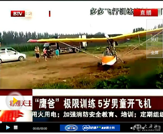 何烈胜:我们对他的身体以及安全上的,作为父母,是首要考虑的一个问题。我们选择了目前就是可以说国内飞机最安全的一种小型操纵性飞机,就是蜜蜂3号。首先它自重非常的轻,也就是发动机停止运转的时候,他仍然可以像滑翔机一样的滑翔。第二个方面呢就是要经过严格的训练,一般来说是要训练100个小时。