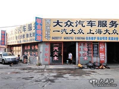 “车胎破了,能修吗?”在西区6号的“大众汽车服务”汽修店,记者询问老板。店门口,还有“钣金喷漆,保险直赔”标牌。