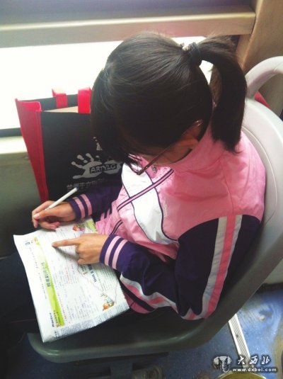 大西北网9月17日讯 9月16日中午,在31路公交车上,一个戴眼镜的小女孩在摇晃的公交车上埋头认真地写着英语作业。车内光线很暗,车也晃得厉害,可这似乎丝毫没影响到小女孩。 (责任编辑:鑫报)