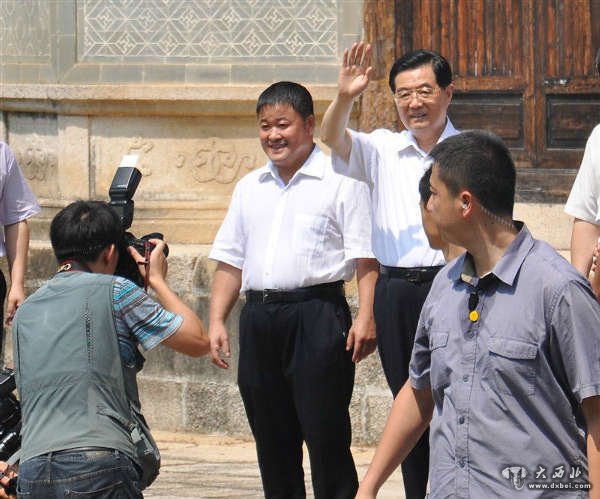 胡锦涛在胡氏宗祠前向父老乡亲挥手