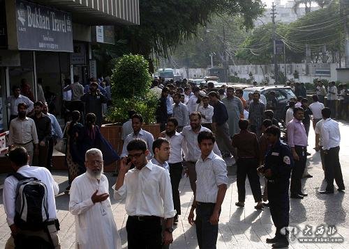 9月24日,在巴基斯坦南部城市卡拉奇,地震发生后人们跑到街上躲避。