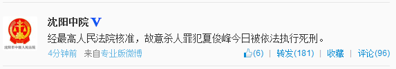 中新网9月25日电 据沈阳市中级人民法院官方微博“沈阳中院”消息,经最高人民法院核准,故意杀人罪犯夏俊峰今日被依法执行死刑。