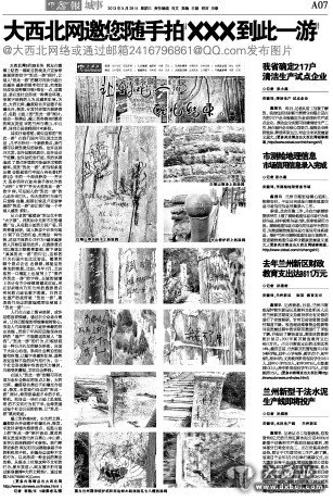 纵观我们的身边,经常会看到一些“涂鸦”,很多美景、剧照被破坏。数月前,大西北网、鑫报曾联合开设随手拍曝光台,转发、专发甘肃境内旅游景点、名胜古迹上“到此一游”图片活动,得到众网民的响应。网友提供了上百张留在文物建筑上的涂鸦照片。所见所闻,触目惊心,个别人的不文明行为,确实向人们敲响了保护文物爱惜景点的警钟!