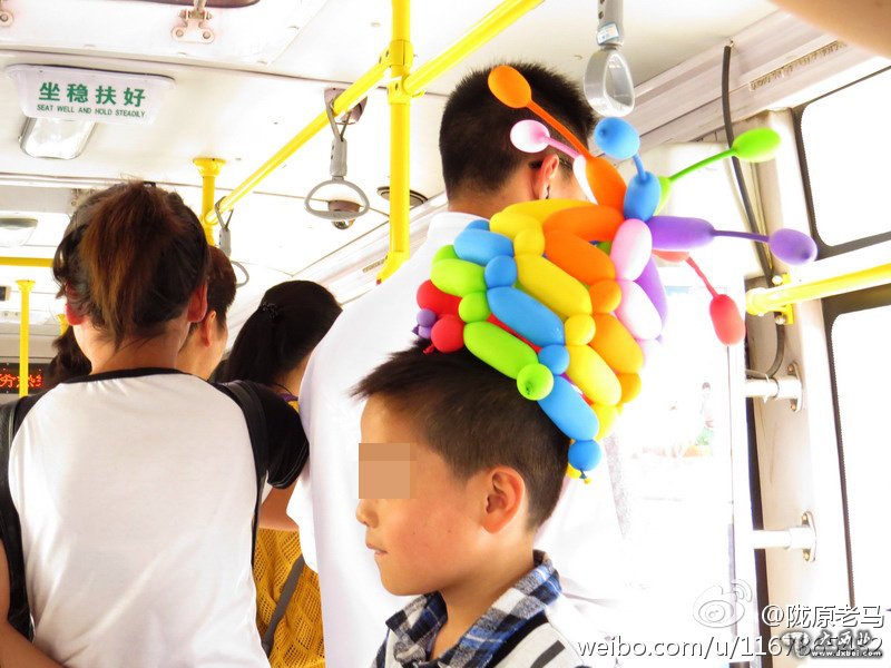 大西北网讯 10月6日下午, 兰州市一小朋友拿着刚买来的气球帽子在公交车上高兴的玩乐,这气球帽子制作精美,很受小朋友的喜爱。人们不得不佩服商家的创意和手艺。