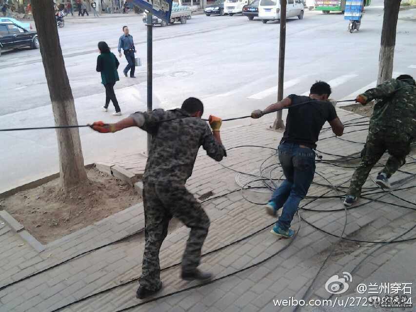 大西北网讯 10月6日17时许,兰州西站人行道上几名工人弯腰拉着电揽,阳光下他们劳作的身影让人感动,记者拍下了这一镜头。