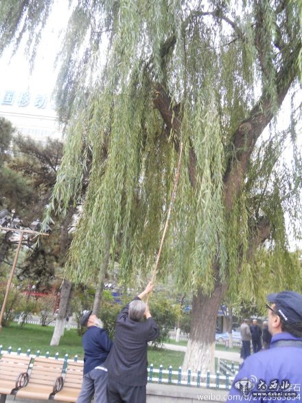 大西北网10月16日讯   10月16日9时许我在兰州黄河河边人行道上看到,一个老头用长竹竿挑摘树上蘑菇。下边一老人用衣服接盛。一会,老人将蘑菇挑了下来,蘑菇发黄长得丰满。老人讲这是天然蘑菇,和肉一起炒味道鲜美.