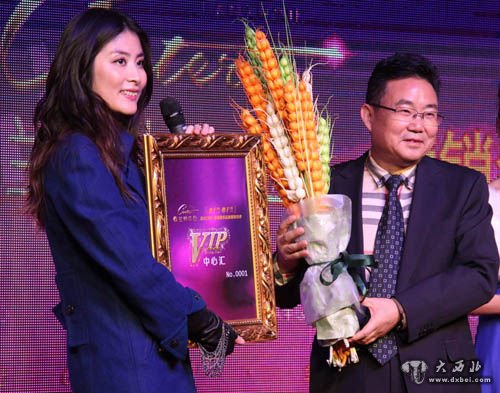 兰州中心\兰州东方友谊商贸中心有限公司总经理魏兴毅和陈慧琳互赠礼品。