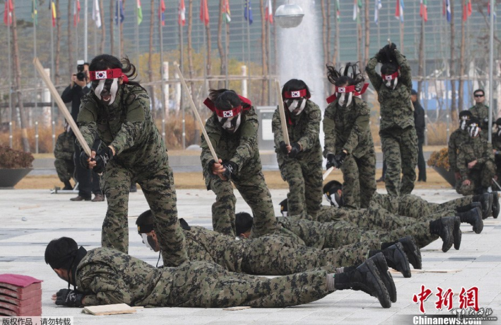 11月3日,韩国高阳,韩国航空国防展开幕,特种兵展示高超军事特技。