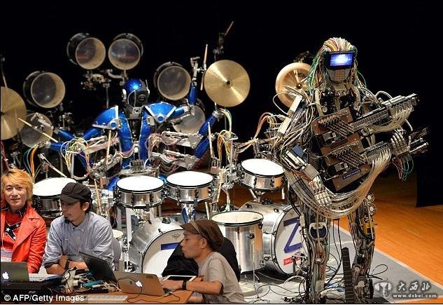 在日本东京的国立新兴科学和创新博物馆,一场艺术与科技的盛会正在进行。吉他手马克(Mach)和鼓手阿舒拉(Ashura)正在演出。