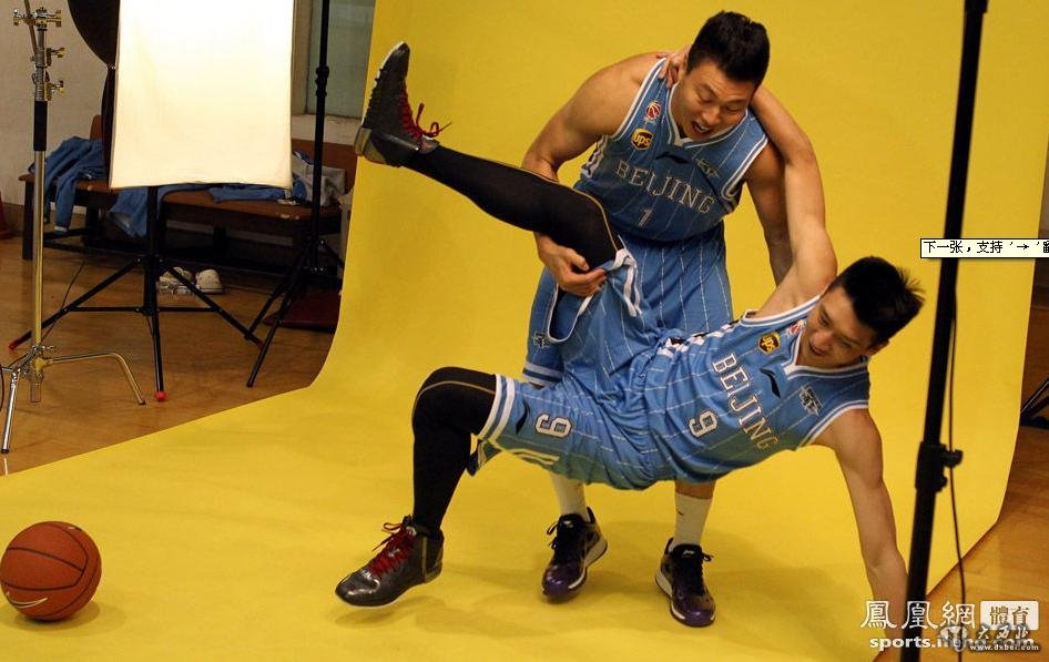 2013年11月6日,北京,北京金隅男篮拍写真恶搞不断,孙悦大秀兰花指惨遭公主抱。
