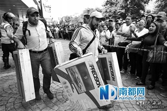路透社报道,中部城市巴伦西亚的一家达卡店遭哄抢。有人发布在互联网的图片显示,人们抱着电视和其他成箱货物跑出商店。