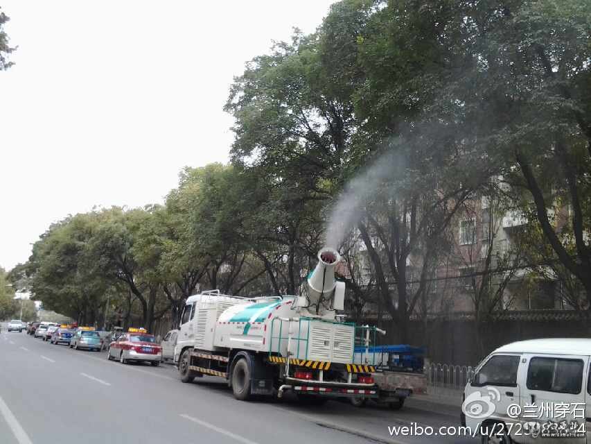 大西北网11月14日讯 本网记者昨日17时许,在兰州滨河路看到一俩加湿车,噴出的水霧弥漫空中。 (责任编辑:鑫报)