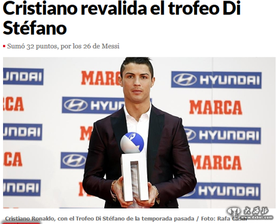 大西北网11月27日讯北京时间11月26日消息,C罗获得了《马卡报》评选的2012-13赛季迪斯蒂法诺奖,该奖为表彰上赛季西甲最佳球员的优异表现,相当于西班牙的“最佳球员奖”,这是C罗连续第二年获奖,而梅西此前三度获奖。