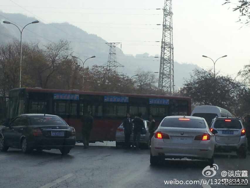 大西北网11月28日讯 本网记者谈应霞报道,南滨河路月星家居广场门口两辆小轿车撞上正在出站转弯的26路公交车,事故车辆横在马路中央,过往车辆需绕行。 (责任编辑:鑫报)