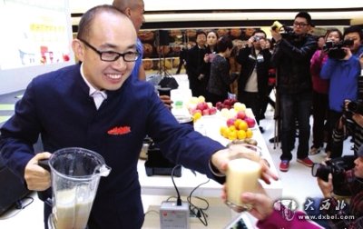 利用家乡苹果给朋友榨果汁 图片来源潘石屹微博