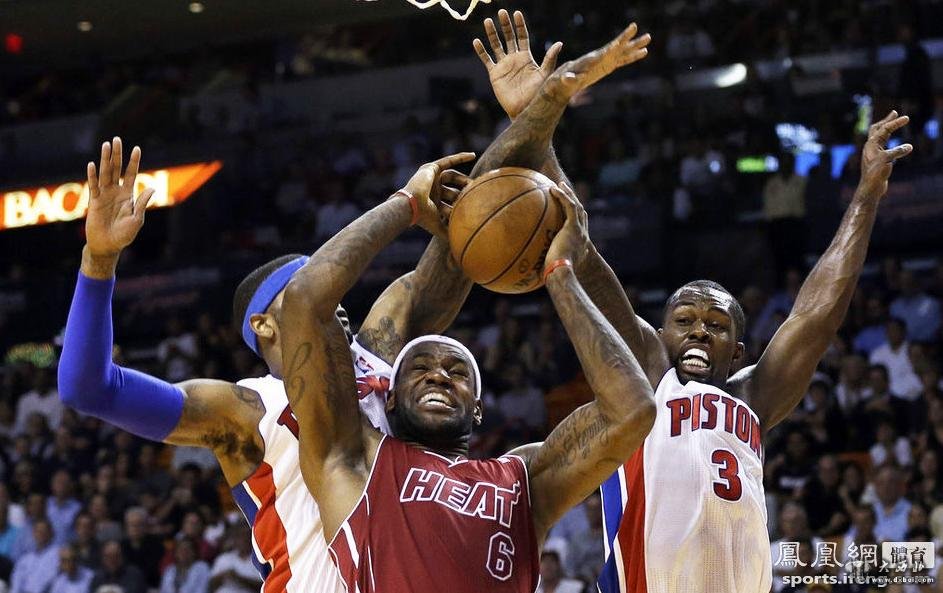 2013年12月4日,NBA常规赛,热火97-107活塞,十连胜终结,詹姆斯23+5。图为詹姆斯遭严防