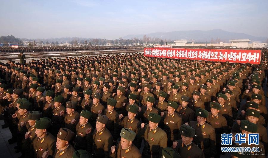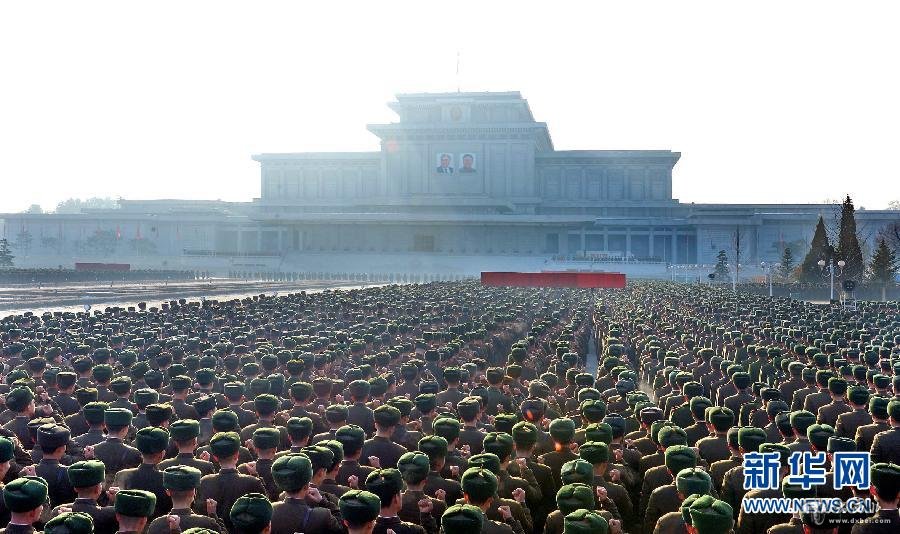 平壤,2013年12月16日 朝鲜人民军举行誓师大会称将誓死保卫金正恩朝中社12月16日提供的照片显示,朝鲜人民军16日在平壤锦绣山太阳宫广场举行誓师大会,决心誓死保卫金正恩。