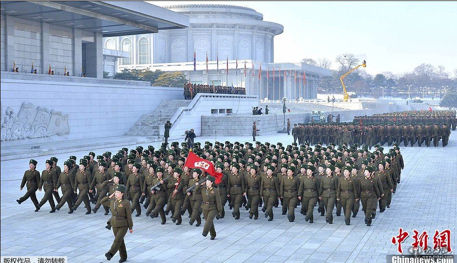 朝中社16日报道,12月17日是朝鲜原最高领导人金正日逝世两周年纪念日。朝鲜16日在平壤锦绣山太阳宫广场举行了朝鲜人民军誓师大会。