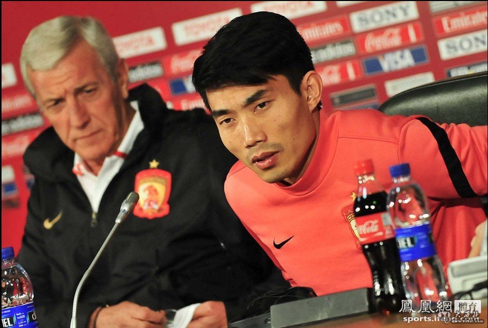 2013年12月17日,摩洛哥,2013年世俱杯半决赛前瞻,广州恒大训练备战拜仁,里皮携郑智出席发布会。