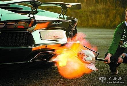 波顿站在跑车后方,将叉着火鸡的叉子举在排气管口。当这辆兰博基尼的发动机达到惊人的9000转后,排气管喷出巨大的火焰。利用这强大的喷火,大约十分钟后,火鸡就烤好了,外表焦黄,“卖相”甚佳。